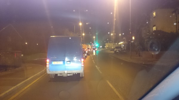 Photograph looking up Bridge Road, trying to get on to Northend Road, stuck in tailback congestion that never used to be there.